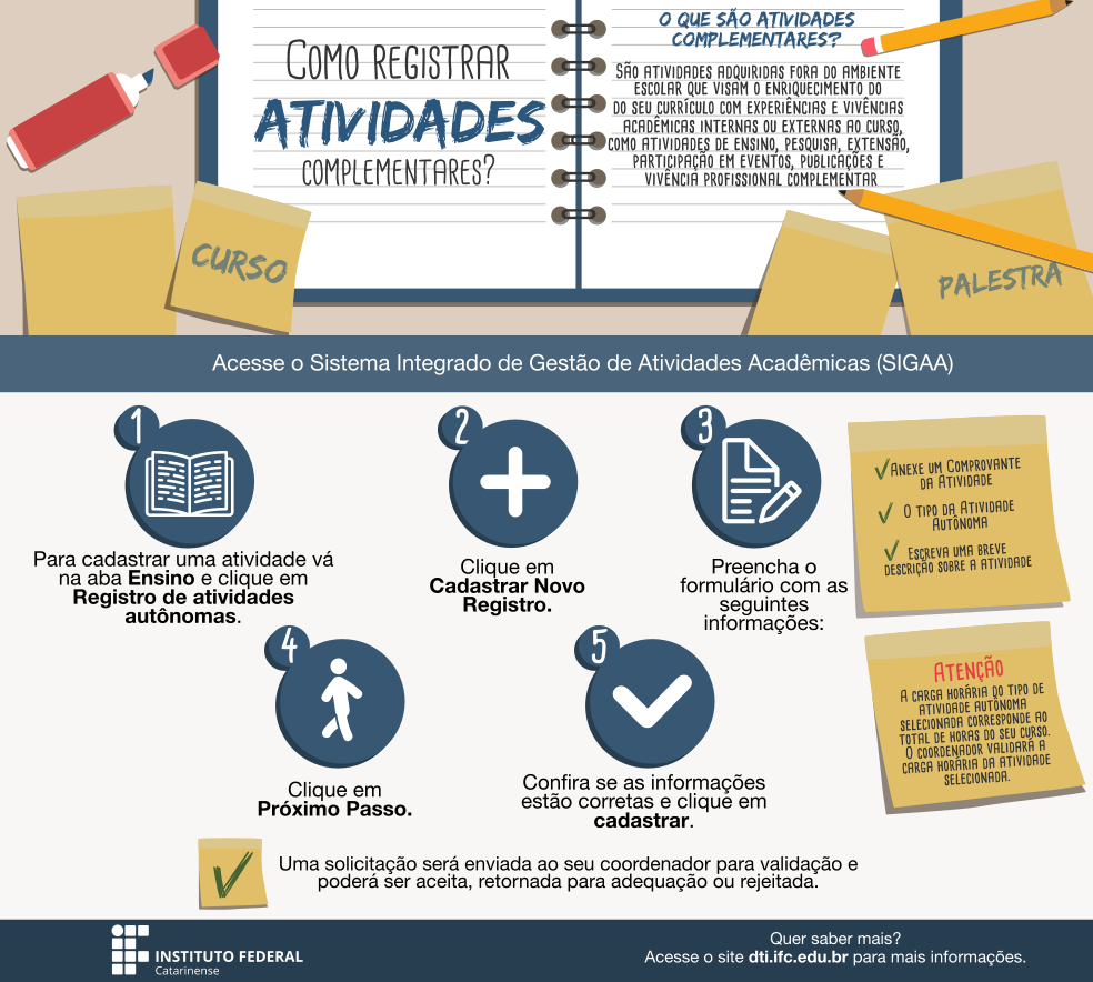 - 02/03 – GRADUAÇÃO: Abertura do período para 2026/1 de VALIDAÇÃO DE ATIVIDADES COMPLEMENTARES (via SIGAA). Orientação disponível em: https://manuais.dti.ifc.edu.br/lib/exe/fetch.php?media=wiki:suporte_tecnico:atividade-completentar-discente-graduacao.png