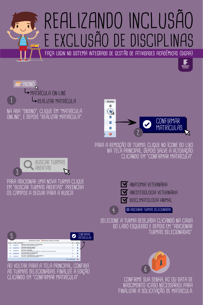 - 30/01 – Processamento das MATRÍCULAS* (DTI/Reitoria) – IMPORTANTE: O resultado de suas solicitações deve ser conferido, através daverificação do seu Atestado de Matrícula (SIGAA).